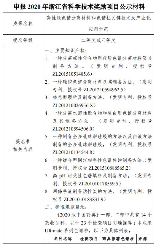 根据《浙江省科学技术厅关于开展2020年度浙江省科学技术奖提名工作的通知》(浙科发成〔2020〕44号)规定,月旭科技(上海)股份有限公司全资子公司,浙江月旭材料科技有限公司以薛昆鹏同志作为主要完成人的科技成果“高性能色谱分离材料和色谱柱关键技术及产业化应用示范(成果名称)”拟提名2020年浙江省科学技术进步奖二等奖或三等奖,现将相关信息予以公示(见详情)。公示时间为2020年9月18日至9月25日(7天)。