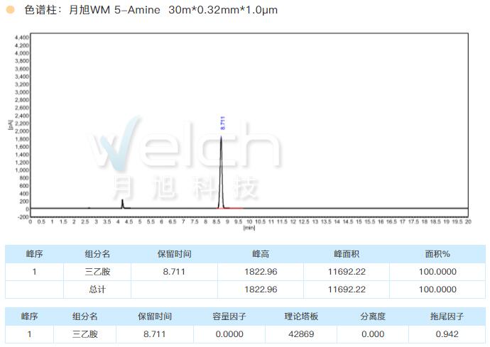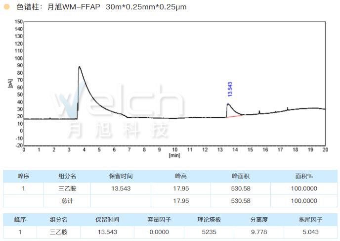 月旭科技胺改性柱WM 5-Amine 30m*0.32mm*1.0μm 检测三乙胺有很好的峰形和柱效。由于这一类物质在系统中也可能有残留,故仪器各部件也进行对应的清洗更换。